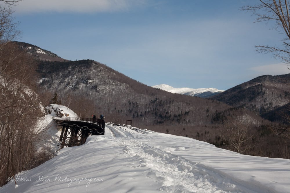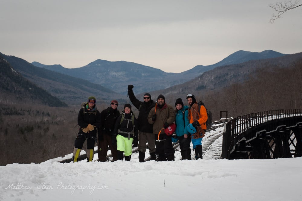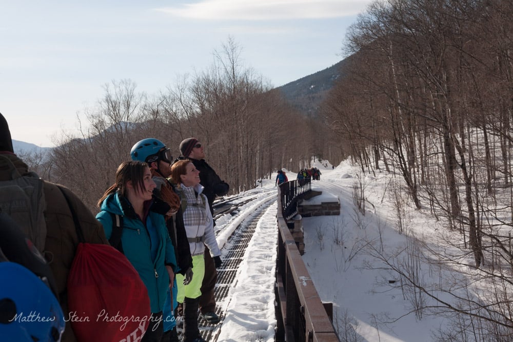 Frankenstein wall is in the New Hampshire White Mountains. Near Crawford Notch off route 302. There's a short hike up to a railway line, and a mile or so down the trestle. We passed classic climbs like The Standard Route and got a clear view from the tracks at the amphitheater. We spied the summit of Mount Washington crystal clear, just a few miles away.