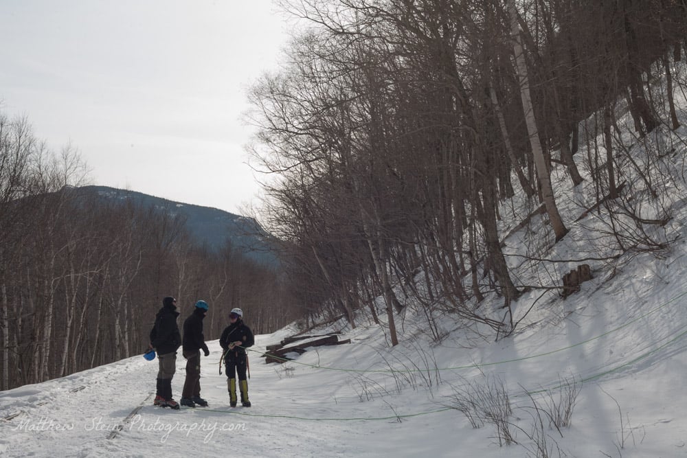 Shooting is a fun challenge. The easiest shot is from below, up towards the person on the wall. Those are the spectator seats, but its still more than most people will ever see in person. On this wall I had access on the right and left of the ice we were climbing. Snow fields with a few trees bookended our wall. They made for relatively easy scrambling. Packing the snow down properly, I made myself a little seat.